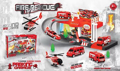 产品名称: 消防停车场带灯光音乐 (4只塑料滑行车+1只塑 料飞机)
